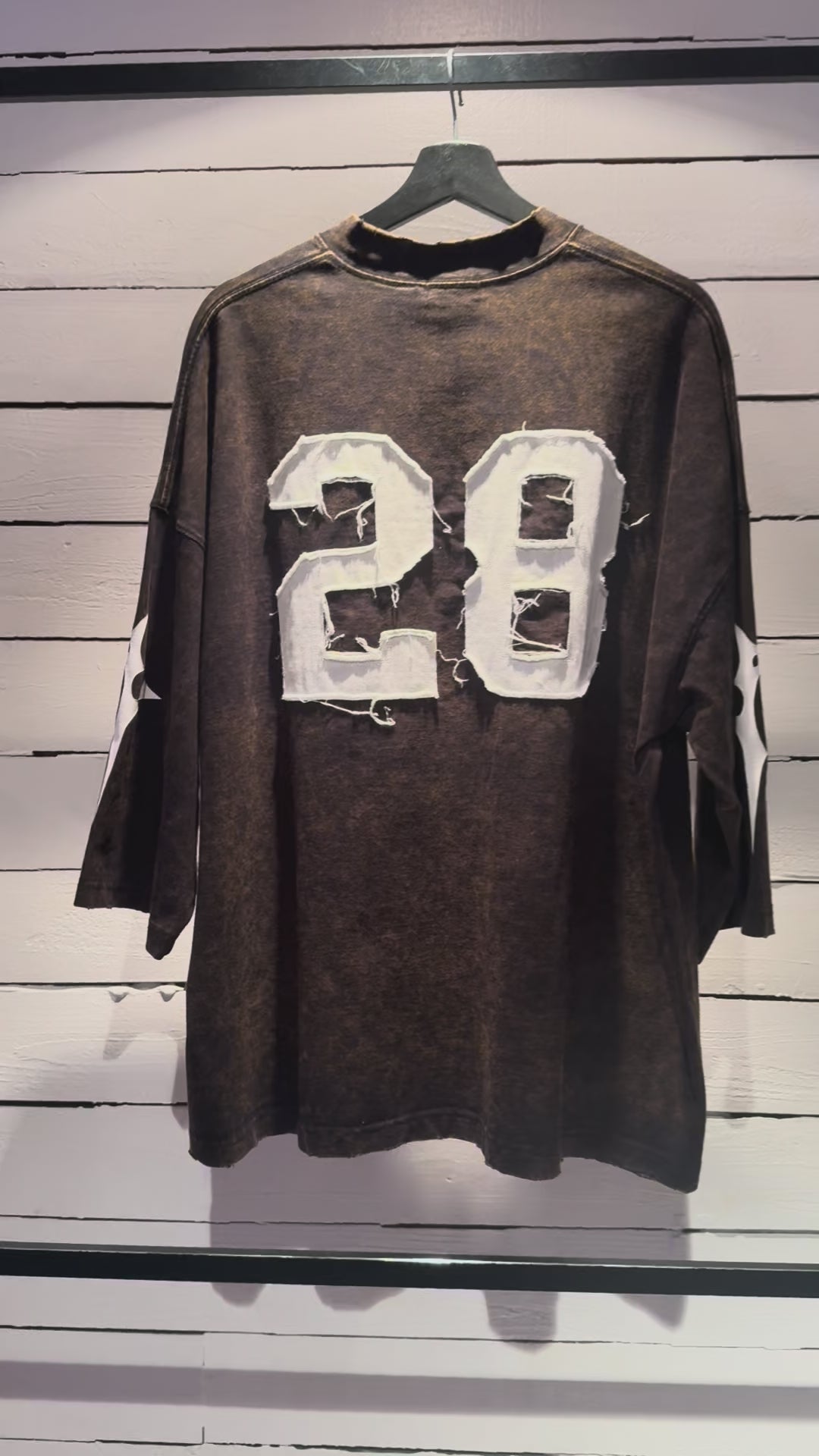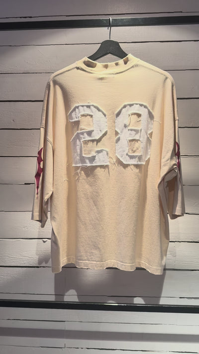 アシッドウォッシュをかけ、ダメージ加工を施したフットボールTシャツ。両袖にロゴプリント、バックにはナンバーのヴィンテージアップリケをオン。7分袖のオーバーサイズシルエット。